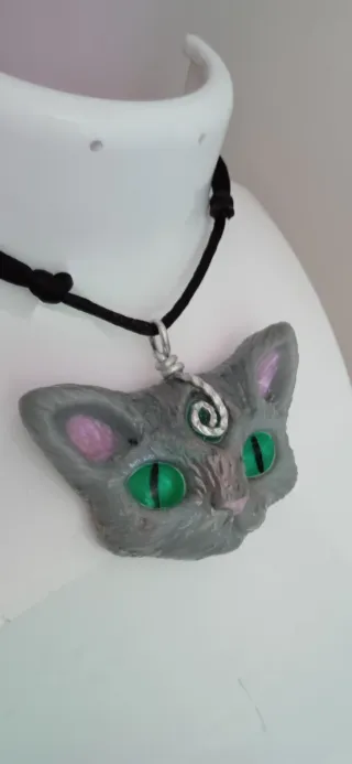 Colgante artesanal con forma de cabeza de gato. - Detalle de alambre plateado en espiral. - Ojos verdes brillantes. - Orejas con interior rosa.