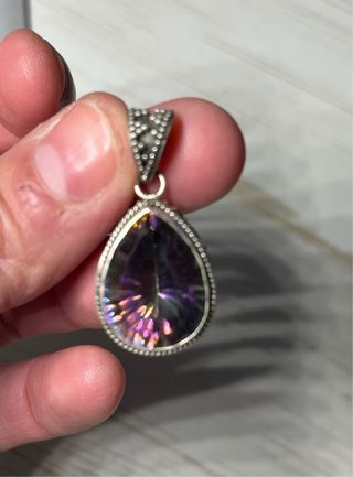 Elegante colgante con un cuarzo místico y plata 925. El Cuarzo Místico potencia la energía personal, disipa la negatividad, fomenta la intuición y la conexión espiritual, ayudando en la sanación emocional, atrayendo la abundancia y equilibrando los chakras, ofreciendo protección y claridad para manifestar metas y superar traumas pasados.