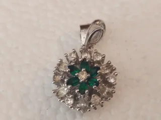 Bonito colgante con diseño de flor. - Detalle central de piedras verdes. - Alrededor, piedras blancas y transparentes. - Colgante de metal plateado.