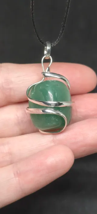 Colgante con un mineral natural de aventurina verde, envuelto en un diseño de plata.Nuevo. - Piedra de aventurina pulida. - Montura jaula con baño de plata. - Incluye cordón negro. -Calidad extra. -Mide 2,5cm x 1,5cm.