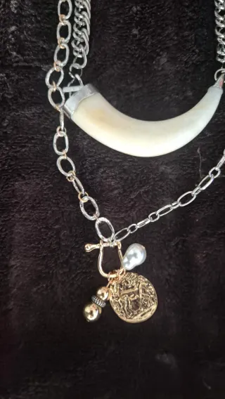 Colgante de Zara con diseño de cuerno y detalles metálicos. - Cadena doble plateada. - Colgantes adicionales: moneda dorada y perla. -fuera de stock, precio en tienda 29.95