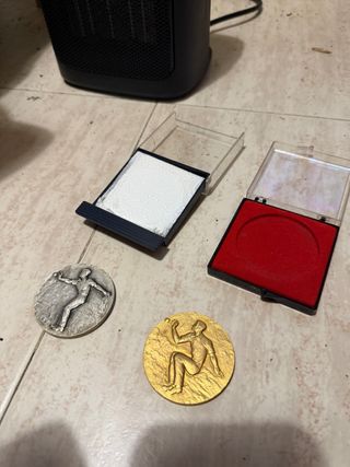 Conjunto de dos medallas conmemorativas, una en tono dorado y otra plateado, ambas con diseño deportivo. - Medalla con acabado dorado. - Medalla con acabado plateado. - Diseño de figura humana lanzando una bola.