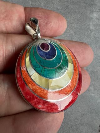 Colgante NUEVO de plata peruana artesanal incrustado a mano con piedras y conchas naturales. Representa la Pachamama, Madre Tierra. Las incrustaciones crean un efecto de círculos concéntricos con los colores del arcoiris. Medidas 3.5 cm de diámetro Recibirá el producto mostrado en las imágenes presentado en una bolsita de tela Trabajamos directamente con las familias de orfebres productores en el Valle Sagrado, Perú. Plata 950 con contraste incrustada con turquesa, sodalita, madreperla y concha spondylus Más pendientes, anillos y colgantes de plata peruana disponibles en nuestro perfil filtrando por la palabra “plata”