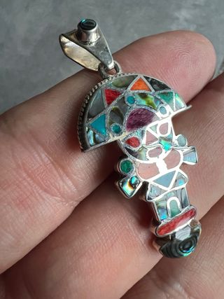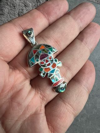Colgante artesanal NUEVO de plata peruana 950 incrustado a mano con piedras y conchas naturales. Representa al Tumi, Dios de la medicina. Pendientes a juego disponibles (consultenos) Medidas 5 cm x 2.3 cm Recibirá el producto mostrado en las imágenes presentado en una bolsita de tela. Trabajamos directamente con las familias de orfebres productores en el Valle Sagrado, Perú. Plata incrustada con turquesa, sodalita, madreperla y concha spondylus Más pendientes, anillos y colgantes de plata peruana disponibles en nuestro perfil filtrando por la palabra “plata”