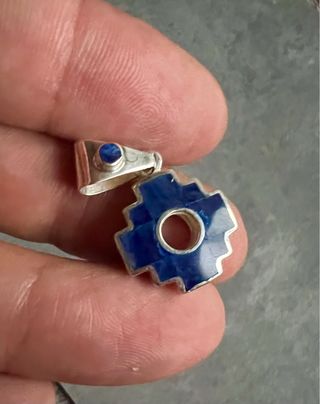 Colgante Nuevo reversible artesanal. Pequeña Chakana (cruz andina) en plata 950 incrustada con piedra sodalita por un lado y reverso labrado con trilogía andina (cóndor, puma y serpiente). Hecho a mano por una familia de artesanos del valle sagrado en Perú. Mide con enganche 3 cm x 1.8 cm Disponible en diferentes colores. Recibirá el colgante que se muestra en las imágenes individuales presentado en bolsita de tela La chacana simboliza en los Andes la conexión entre el mundo terrenal y el mundo celestial. Representa una escalera hacia el cielo. Enviamos a toda España, Italia y Portugal. NO REALIZAMOS ENTREGA EN MANO EN MADRID