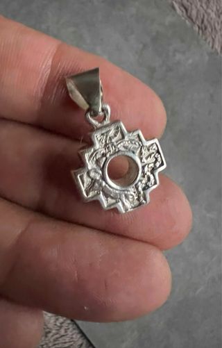 Colgante Nuevo reversible artesanal. Pequeña Chakana (cruz andina) en plata 950 incrustada con piedra serpentina por un lado y reverso labrado con trilogía andina (cóndor, puma y serpiente). Hecho a mano por una familia de artesanos del valle sagrado en Perú. Mide con enganche 3 cm x 1.8 cm Disponible en diferentes colores. Recibirá el colgante que se muestra en las imágenes individuales presentado en bolsita de tela La chacana simboliza en los Andes la conexión entre el mundo terrenal y el mundo celestial. Representa una escalera hacia el cielo. Enviamos a toda España, Italia y Portugal. NO REALIZAMOS ENTREGA EN MANO EN MADRID