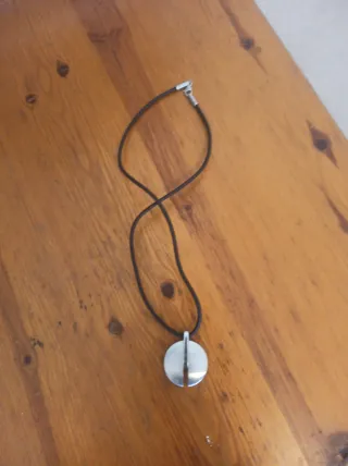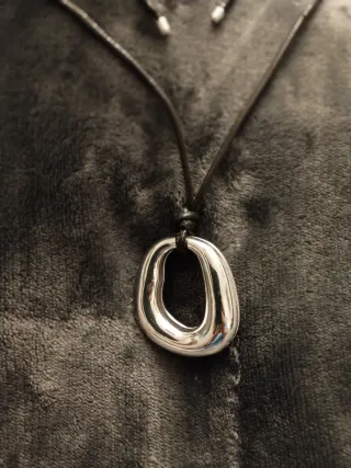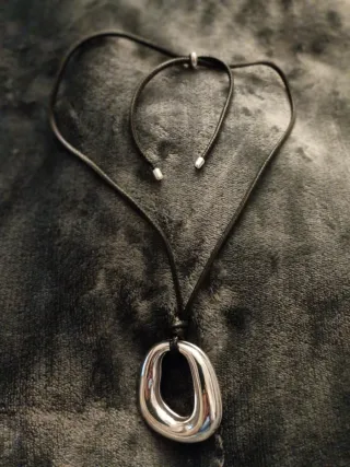 Elegante collar con cuerda de cuero negro y un llamativo colgante plateado. - Diseño moderno y minimalista. - Cierre ajustable para mayor comodidad.