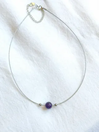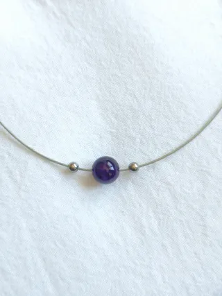 Elegante colgante con una piedra amatista central y dos pequeñas cuentas plateadas. - Piedra central de amatista. - Cuentas plateadas. - Cadena fina plateada.