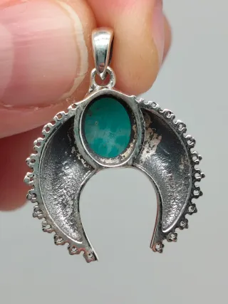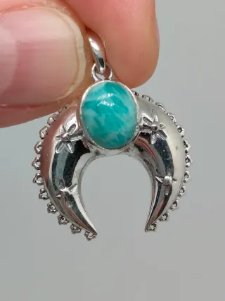 Precioso colgante con forma de luna creciente, elaborado en plata de ley 925 y adornado con una gema de amazonita. - Diseño de media luna. - Detalle de pequeñas flores y abalorios en el borde. - Gema central ovalada de amazonita.