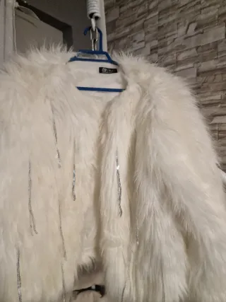 Elegante abrigo corto con un diseño moderno y llamativo. - Material principal de pelo sintético blanco. - Adornado con finas cadenas plateadas colgantes. - Corte corto y moderno.