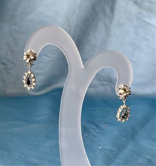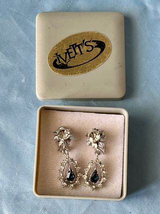 Elegantes pendientes de la marca Ivett's con un diseño colgante. Bisutería de alta calidad - Detalle de piedra azul en forma de lágrima. - Adornos de pedrería transparente alrededor. - Cierre de clip.
