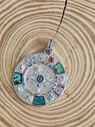Elegante colgante de plata de ley con un diseño circular. - Detalle de circonitas alrededor de la piedra central. - La piedra central presenta un diseño multicolor.