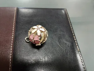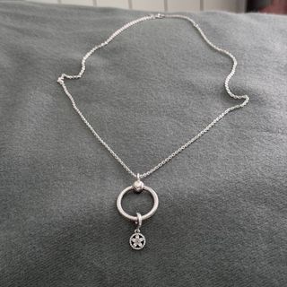 Elegante conjunto de cadena y colgante Pandora. - Cadena de plata. - Colgante con forma de aro. - Charm de flor con detalles. - Cierre de mosquetón.