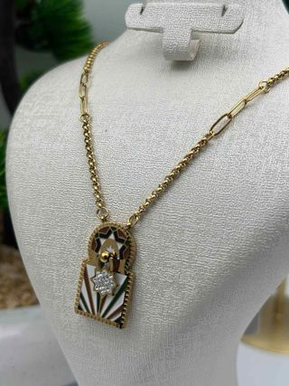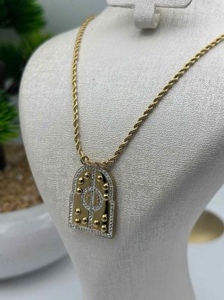 Elegante collar con un colgante de diseño oriental. - Colgante con detalles en dorado y plateado. - Cadena estilo soga. - Diseño único y llamativo.
