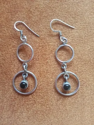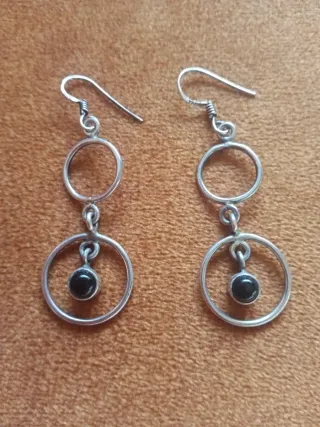 Elegantes pendientes de plata 925 con un diseño moderno. - Colgante de aro. - Detalle de piedra negra. - Cierre de anzuelo.