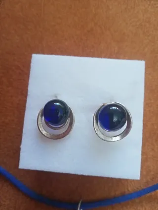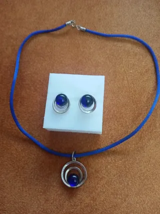 Elegante conjunto de joyería de plata 925. - Incluye un par de pendientes y un colgante a juego. - Diseño moderno con detalles circulares. - Cada pieza está adornada con una gema azul.