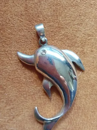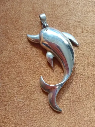 Este es un colgante antiguo con forma de delfín. - Diseño detallado. - Acabado plateado.