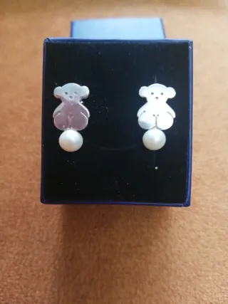 Pendientes de plata con diseño de osito y perla colgante. - Diseño de osito. - Detalle de perla. - Plata.