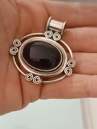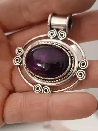 Elegante colgante elaborado en plata de ley 925 con una cautivadora piedra semipreciosa de amatista. - Diseño ovalado con detalles en espiral. - Engaste de plata texturizada alrededor de la gema. - Cierre tipo asa para cadena. - 20 gramos. - Se entrega en una bolsita de joyería elegante para regalo. - La amatista es una variedad de cuarzo cristalino de color violeta. Su tono único se debe a la presencia de iones de hierro y a la exposición a las radiaciones naturales de la Tierra. Esta piedra semipreciosa es muy apreciada por sus propiedades estéticas y energéticas.