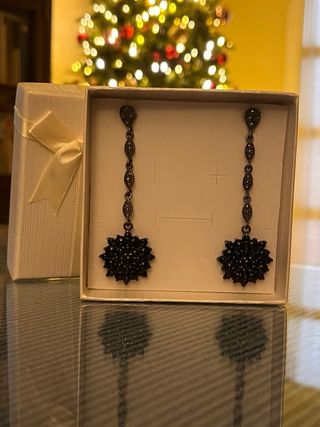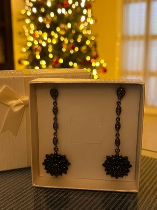 Elegantes pendientes largos con detalles en azabache y plata, perfectos para ocasiones especiales -Originales y exclusivos -Muy elegantes - Diseño colgante con flor en la parte inferior. - Cadena con pequeños adornos. - Cierre seguro para llevarlos cómodamente -Envío en caja regalo