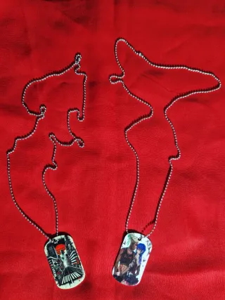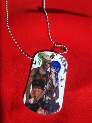 Collar con placa de diseño único que representa una metrópolis futurista japonesa. - Diseño de personajes de la serie ARCANE del juego LOL - Diseño detallado de la ciudad con un atardecer. - Cadena de cuentas plateada.c/u 7€# cadenas#colgantes#joyeria#visuteria#colganteconplaca#placas#