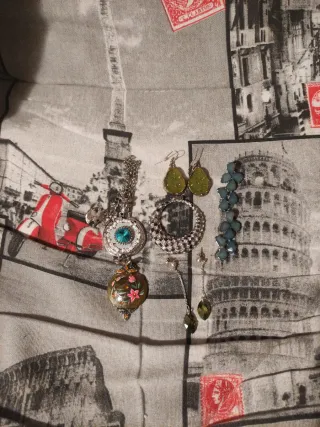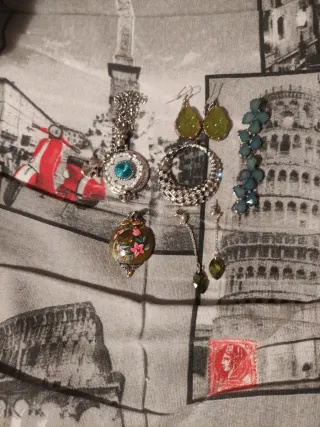 Conjunto de bisutería con varios accesorios. - Pendientes con piedras verdes. - Collar con colgante decorado. - Pulsera de eslabones plateados.