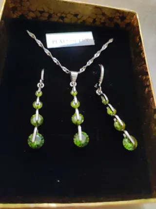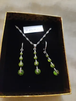 Colgante de plata con granate en forma de corazón. Pendientes con piedras verdes ovaladas.