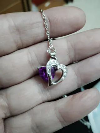 Elegante colgante con forma de corazón, adornado con una amatista morada y circonitas brillantes. - Diseño de doble corazón. - Cadena fina plateada de acero inoxidable el corazón si es plata