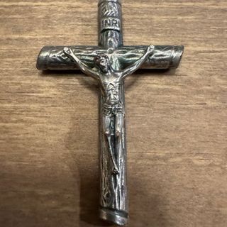 Este es un crucifijo de plata con la figura de Jesús. - Diseño detallado de la figura de Jesús. - Inscripción INR en la parte superior de la cruz.