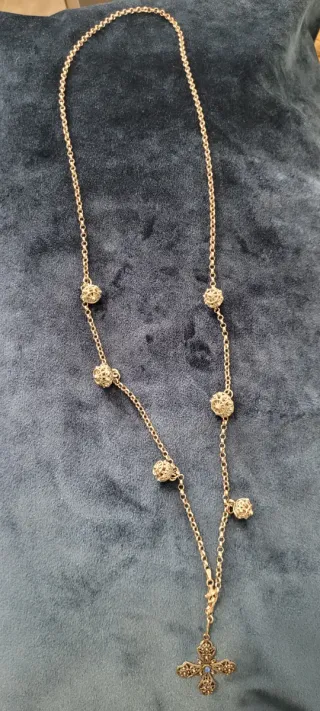 Elegante cadena de plata de 70 cm con un colgante de cruz y manzanetas charras en filigrana de plata. - Diseño de filigrana detallado en la cruz. - Manzanetas charras decorativas a lo largo de la cadena.