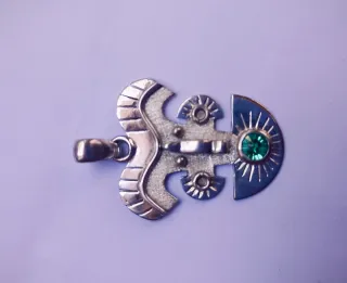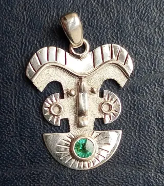 Precioso colgante de estilo precolombino, elaborado en plata de ley 975 y adornado con una esmeralda central. - Diseño inspirado en arte precolombino. - Engaste de esmeralda. - Plata 975 de alta calidad.