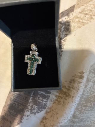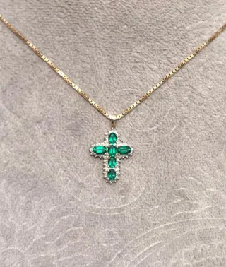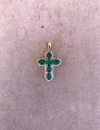Elegante colgante con forma de cruz, adornado con circonitas y esmeraldas. - Diseño de cruz. - Detalles en circonitas. - Acentos en esmeraldas.