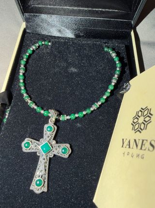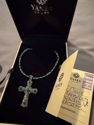 Elegante colgante con forma de cruz de la marca Yanes. - Diseño detallado con esmeraldas. - Elaborado en plata de ley. - Cadena de cuentas verdes y plateadas.