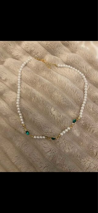 Elegante collar de perlas con un detalle central. - Perlas blancas de aspecto marcado. - Colgante con forma de rombo en color verde esmeralda. - Elementos metálicos dorados y pequeños detalles de pedrería.