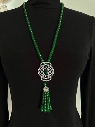 Elegante collar largo con cuentas verdes y un detalle de colgante ornamentado. La pieza central presenta un diseño intrincado con una gema verde en el centro y detalles plateados. - Cuentas de color verde esmeralda. - Colgante con diseño calado y gema central. - Borla decorativa en la parte inferior. Solo hago envios. Os invito a qué miréis mi página, tengo bastantes cosas interesantes que os pueden interesar. (◕‿◕✿)