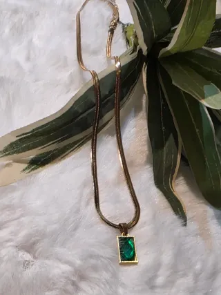 Elegante collar con un diseño llamativo. - Cadena dorada tipo serpiente. - Colgante rectangular con piedra verde. - Acabado brillante.