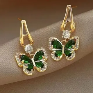 Elegantes pendientes con diseño de mariposa y detalles brillantes. - Aro dorado. - Colgante de mariposa con piedras verdes y blancas.