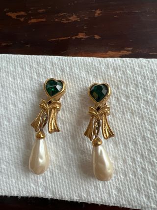 Elegantes pendientes con diseño de corazón y perla colgante, comprados en Boston. - Detalle de corazón con piedra verde. - Colgante de perla en forma de lágrima. - Acabado dorado.