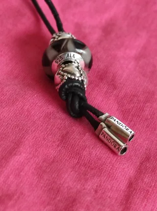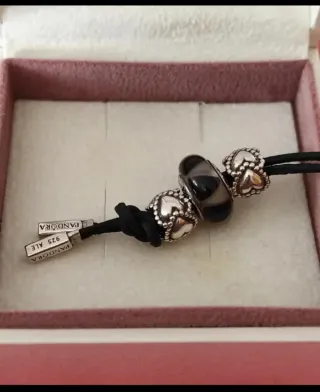 Colgante de cuero negro con tres charms, todo Pandora auténtico - Dos charms son de plata con diseño de corazones enlazados - Un charm central de cristal murano negro. - Cordin con dos terminales de plata grabados con Pandora 925 ALE.