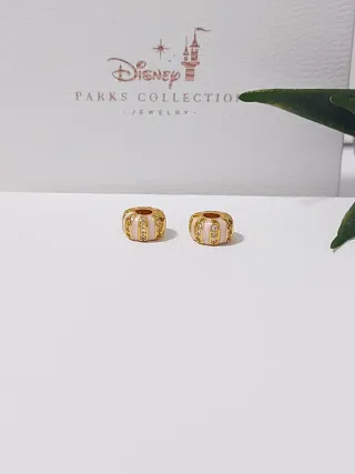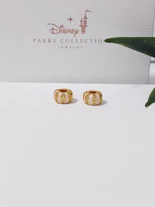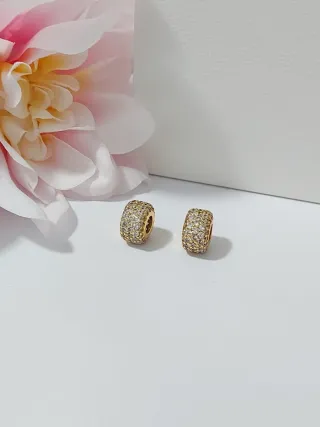 Dos charms estilo barril de Pandora, adornados con pequeñas circonitas brillantes. - Diseño pavé con circonitas. - Acabado en tono dorado.