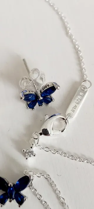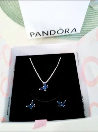Precioso conjunto de joyería Pandora con diseño de mariposa. - Colgante con cadena. - Pendientes a juego. - Detalles en azul y plata. - Se vende con su caja. - No hago envíos.