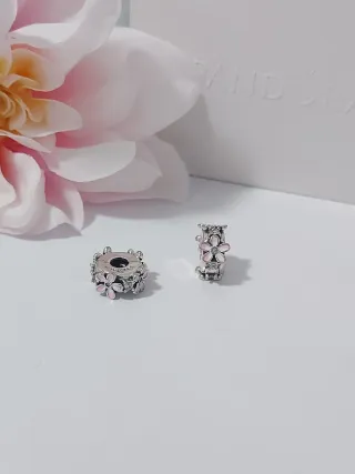 Dos charms de la marca Pandora con un delicado diseño de flores. - Detalle de flores en color rosa. - Acabado en plata. - Diseño floral.