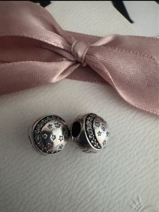 excelente estado. Originales de mi colección privada. Par de clips de la colección Noche Brillante de Pandora. Estos clips están diseñados con un motivo de luna y estrellas, adornados con pequeñas circonitas cúbicas que aportan un brillo sutil. - Diseño de luna y estrellas. - Detalle de circonitas cúbicas.
