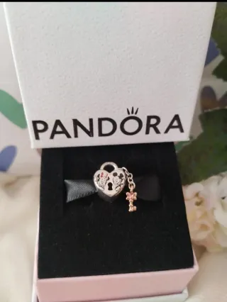 Charm de Pandora con diseño de corazón y figuras de Mickey y Minnie Mouse. Incluye un charm colgante en forma de llave. - Diseño de corazón con siluetas de Mickey y Minnie. - Charm colgante de llave en tono rosa. - Cierre de seguridad. - Se envía en su caja y en 24 horas.