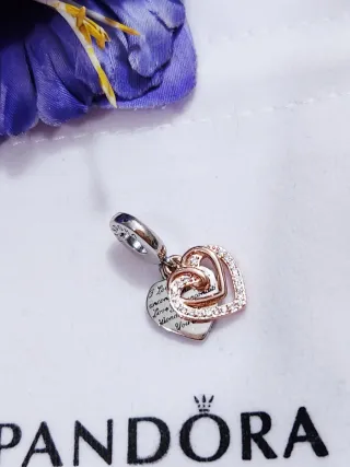 Charm colgante de Pandora con diseño de dos corazones entrelazados. - Un corazón está adornado con pequeñas circonitas. - El otro corazón tiene un grabado con un mensaje. - Combina plata y un acabado en tono rosa. Como nuevo Se vende en una bolsita Pandora