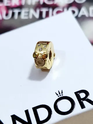 Charm de clip de la marca Pandora, con un diseño inspirado en Mickey y Minnie Mouse. - Detalles de circonitas cúbicas. - Acabado en oro. - Diseño bicolor. Como nuevo en su caja original