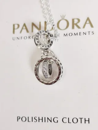 Este colgante de Pandora presenta un diseño elegante de dos aros entrelazados. - Elaborado en plata. - Un aro está adornado con circonitas. - El otro aro lleva grabado el nombre de la marca.