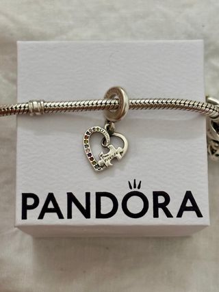 Conjunto de diversos accesorios de joyería. - Collar gargantilla con cierre baño de oro. - Pendientes de circonitas con forma de corazón. - Charms con circonitas, esmalte de Minnie y esmalte de corazón. - Colgante de circonitas en V. Ver fotografías con los productos. Precio por el TOTAL de productos. Incluido las cajas y bolsas de embalaje de la marca Pandora: - Varias bolsas de compra de diferentes tamaños. - Cajas para joyería. - Sobres y protectores para accesorios. - Papel y cinta de pegatinas con el logo de Pandora. Hago envío.