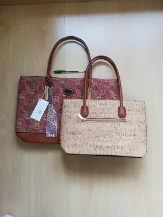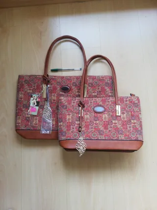 Bolso de hombro en tonos marrones y rojizos, de piel y trasera corcho. Con adornos colgantes de metal dorado. De gran capacidad. Se venden juntos.