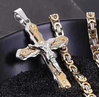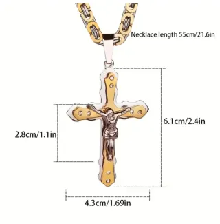 Elegante conjunto de colgante de cruz y cadena para hombre. - Colgante de cruz con detalles en dorado y plateado. - Figura de Jesucristo en relieve. - Cadena tipo bizantina con eslabones dorados y plateados. - Fabricado en acero inoxidable.